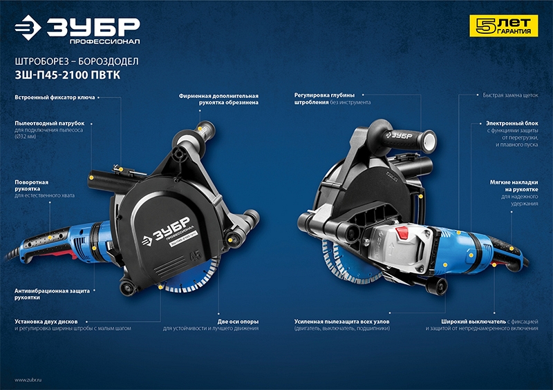 Преимущества штробореза Зубр Профессионал ЗШ-П45-2100 ПВТК: